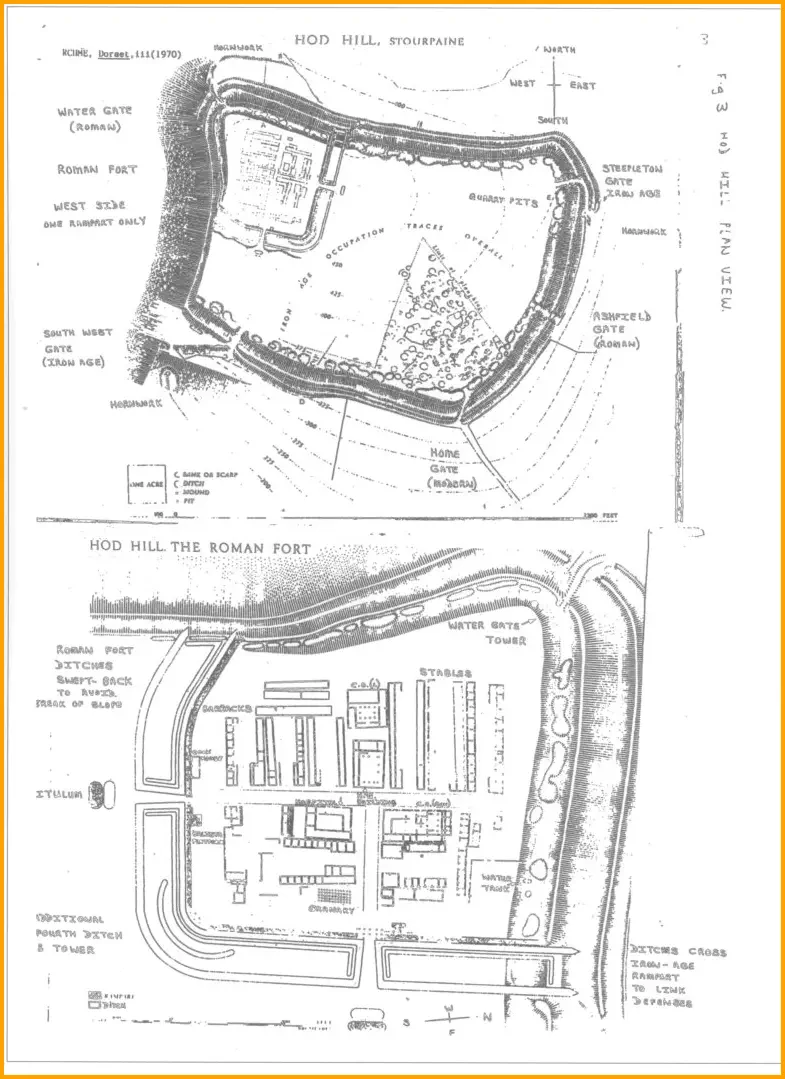 HodHillissituatedintheparish,northwestofthevillagewhereitstandsmodestlybesideitssupposedly moreexaltedneighbour,Hambledon.Thelatter,200feethigherandolderbycenturiesthanHod,could alsoboastthatGeneralWolfe'stroopstrainedonitsslopesbeforegoingtoCanadatostormtheHeightsof AbrahamtodefeattheFrench.Ontheotherhand,Hodhasthedistinctionofextendingtoanareaof54 acresonitssummitcomparedwithHambledon's30acresandisinfactthelargestofDorset'shillforts. ItisalsouniqueinhavingservedasastrategicRomanfortfollowingVespasian'sinvasioninAD43-44.In theperiodof1951-58,eachsummer,ProfessorSirIanRichmondcarriedoutlargescaleexcavationsfor theBritishMuseum.ManyartefactswerediscoveredasRichmondandhisstudenthelpersbroughtthe secrets of ancient history to the surface. The top of Hod Hill is now owned by the National Trust.